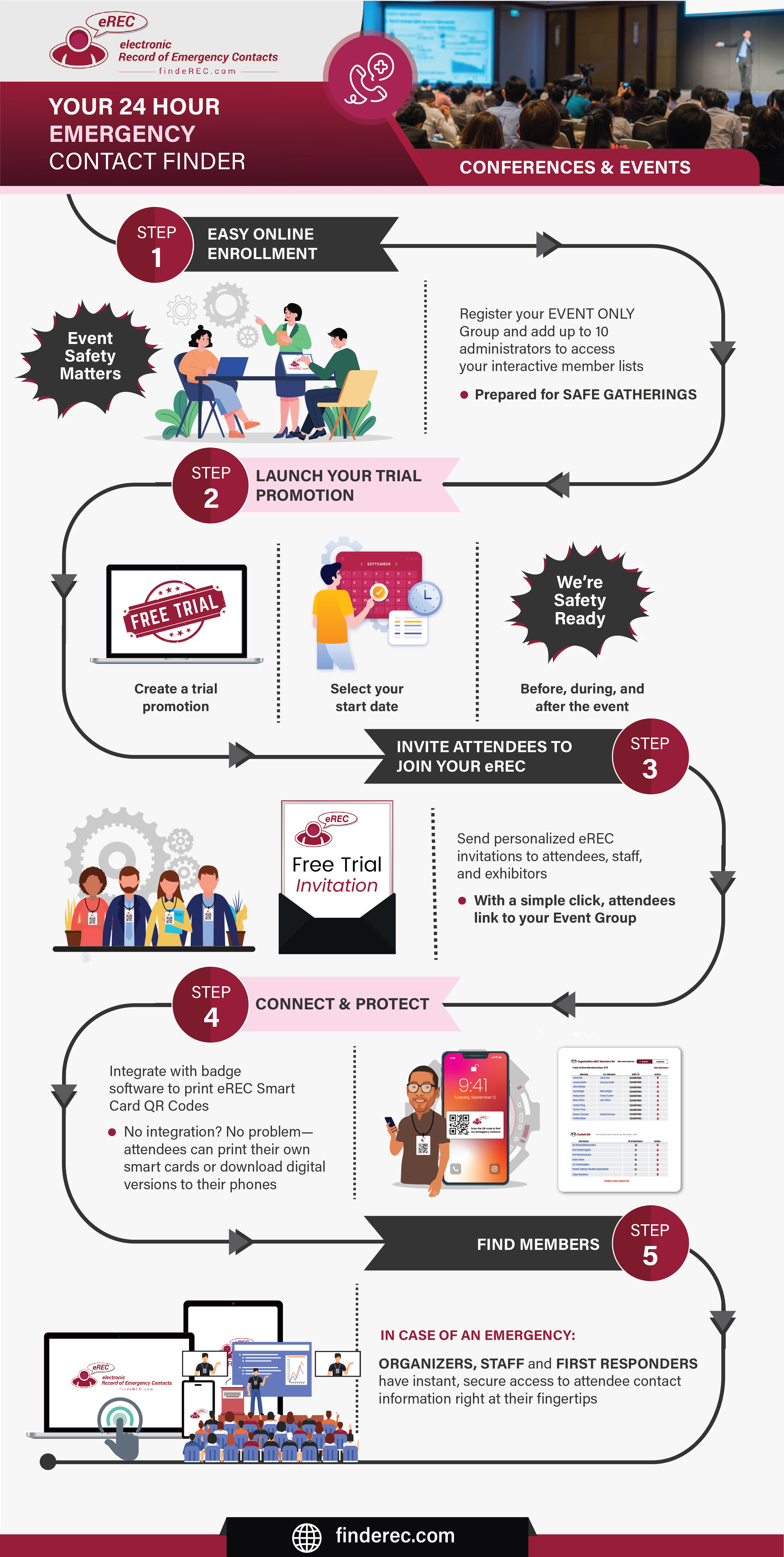 From intimate seminars to multi-day conferences, eREC offers flexible group plans designed to fit events of any scale. Organizers can build a comprehensive safety strategy that includes complimentary trial access—ensuring every participant is connected before the opening keynote and thru the closing remarks—and Emergency Contact Information is readily available if needed.